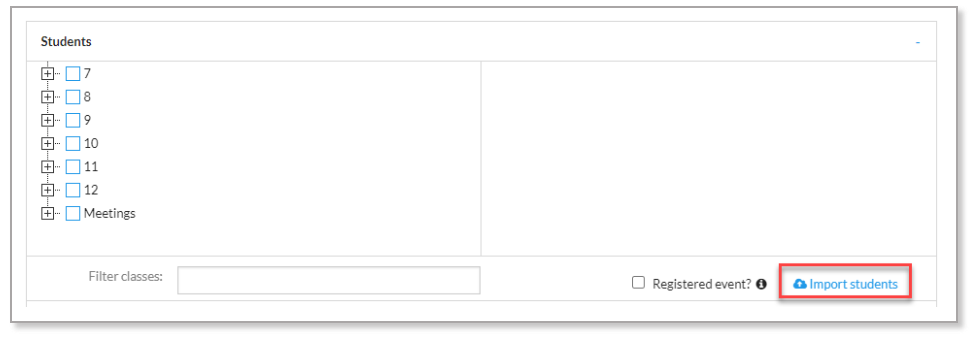The option to import students into a selected event has been added. This will make it easier to select students from multiple year levels.  To import a list of students, select the 'Import students' link that is next to 'Registered event' in the Students panel.