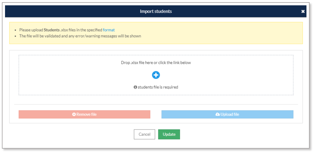 The file can either be dropped into the designated area or selected by clicking the '+' link. Once the file has been selected, click on 'Upload file'. Information regarding the progress of the upload, the number of errors and warnings and the status will be displayed.  Click on 'Update' if the file passes validation.  This will add the students to the event, which will become a registered event.
