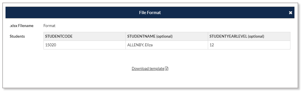 The format for the import file, a .xlsx file, which is displayed when the 'format' link is selected, is shown below. Note that a template can be downloaded in the required format.