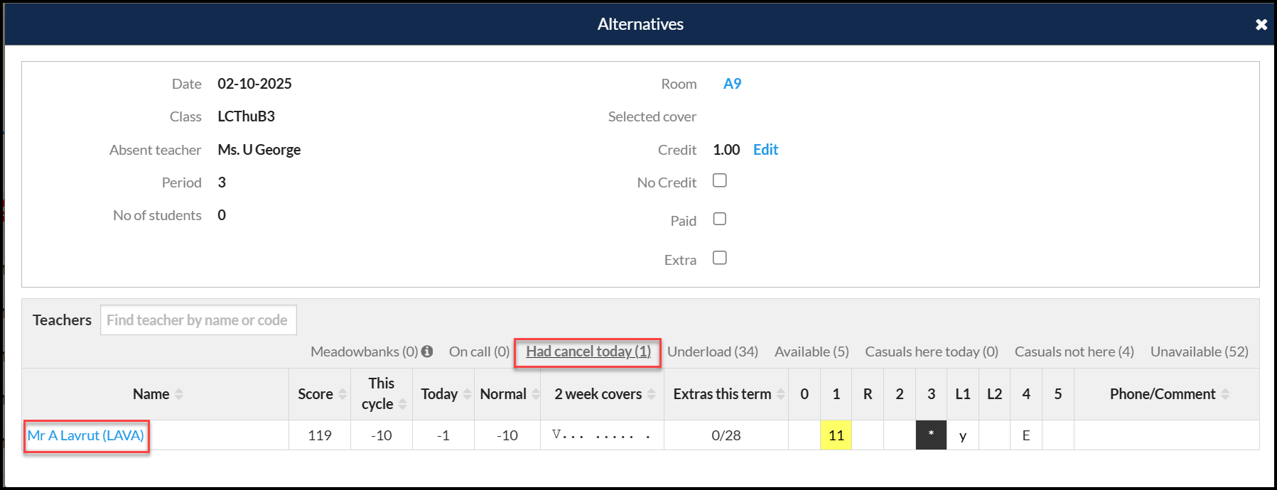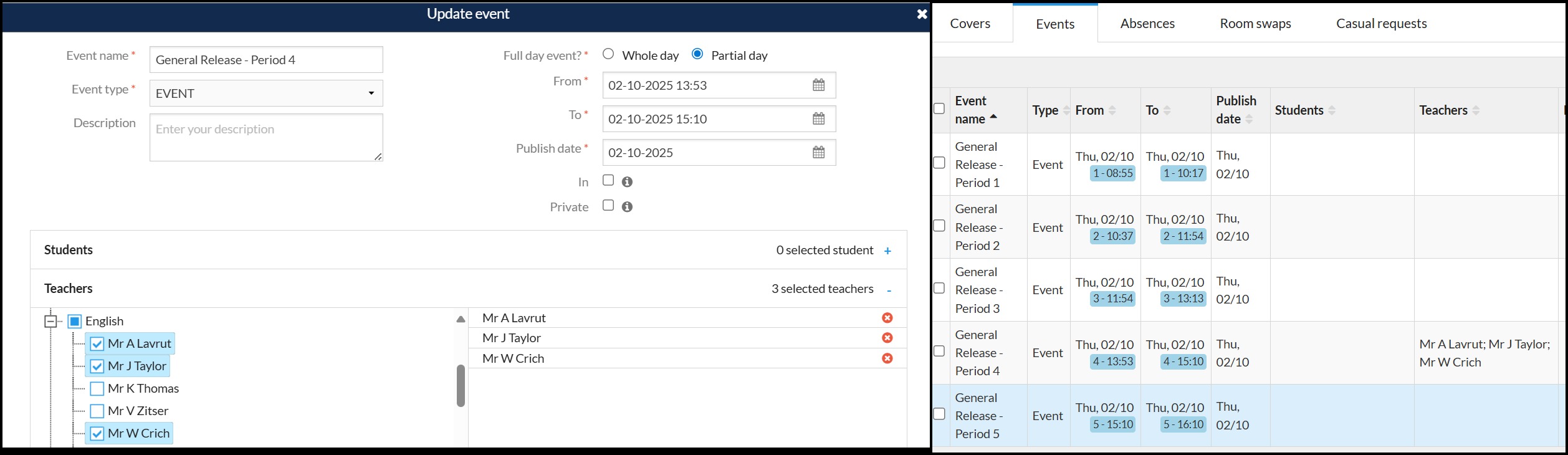 rather than including the teacher in the Event, cover that class using the ‘Lesson Swap’ function by selecting the teacher from the Unavailable tab . Their original class will then appear on the Covers screen for merging.