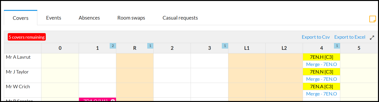 For information on how to merge classes from the Covers screen:  Timetable Daily: Lesson Merge