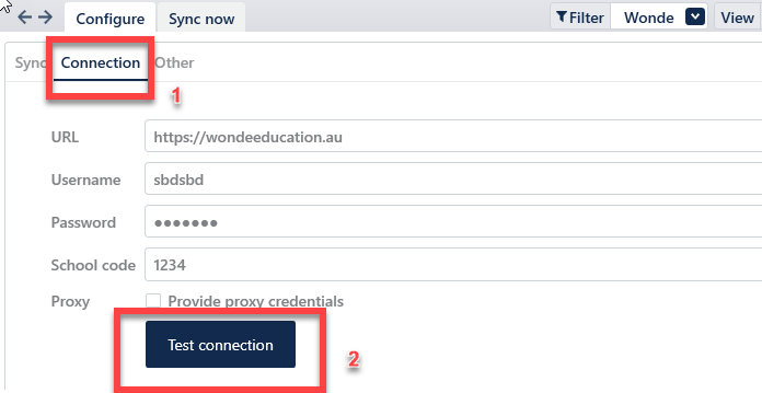 Input your credentials. Wonde will provide you with the Wonde Server URL, Username, Password and School code.