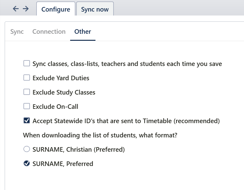 Accept StatewideID's that are sent to Timetable (Recommended). Generally, the Timetable file will obtain statewide ID's from the external school information / admin system (SIS), since this is regarded as source of truth for this field. However, some users want this field for different purposes. In NSW for example, some prefer to have the student code field for the 'ERN' number, but the Statewide ID field for the NSW Board of Studies needs registration number. If so, you may want to untick this, and retain your BOS number in the Statewide ID field