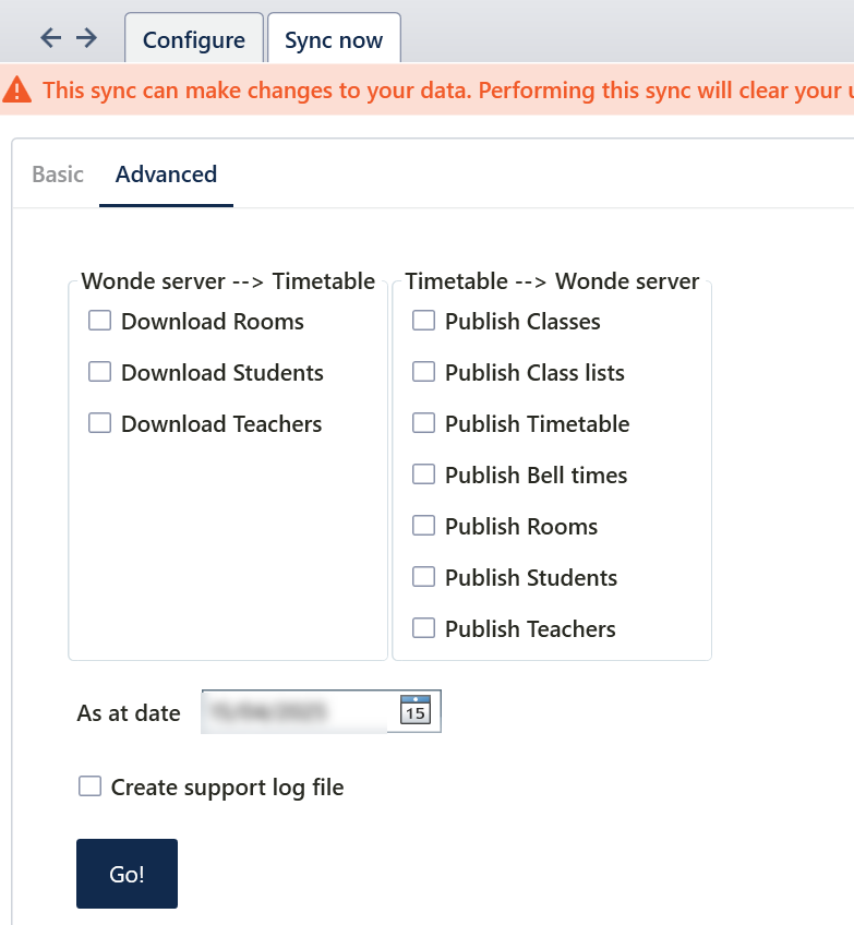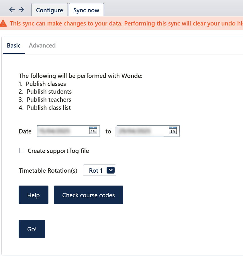 Basic sync is for general syncing. A basic sync allows you to download students from Wonde, and publish classes, class lists and timetable to Wonde. To perform an basic sync: