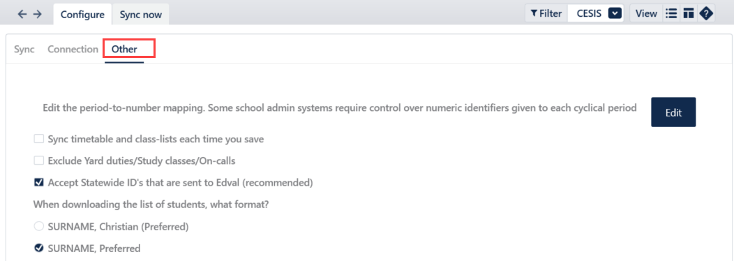 The [Edit] button takes you into a screen where you set up a mapping from Edval periods to CESIS period numbers. It is necessary to fill this out in a way that Edval periods are matched to the correct CESIS period numbers. This configuration information is stored in the .etz file, so you’ll need to save the file for this to be remembered. - Sync timetable & class-list every time you save
