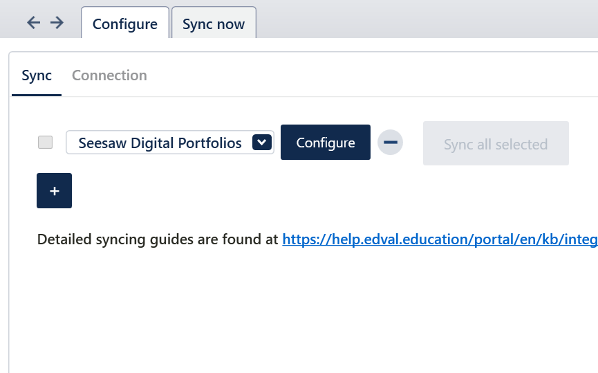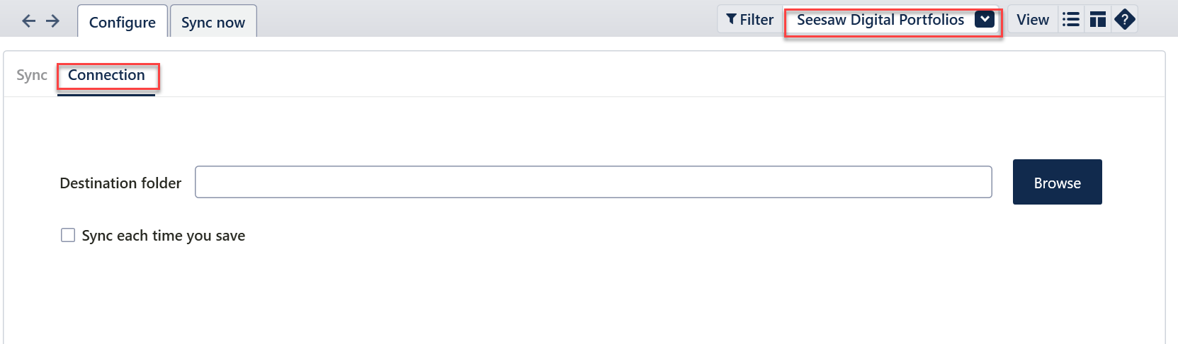 - On the Connection tab, ensure that ‘Seesaw Digital Portfolios’ is selected in the top-right corner.