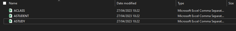 - The three files that are created, called ACLASS, ASTUDENT and ASTUDY are in the folder that was specified earlier.