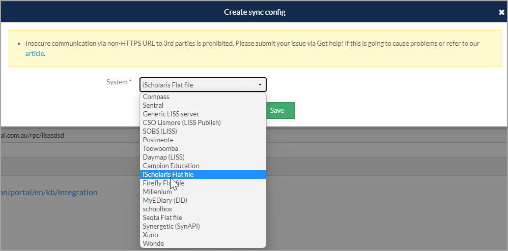 - Choose 'Add sync system' and select iScholaris Flat file from the system dropdown.