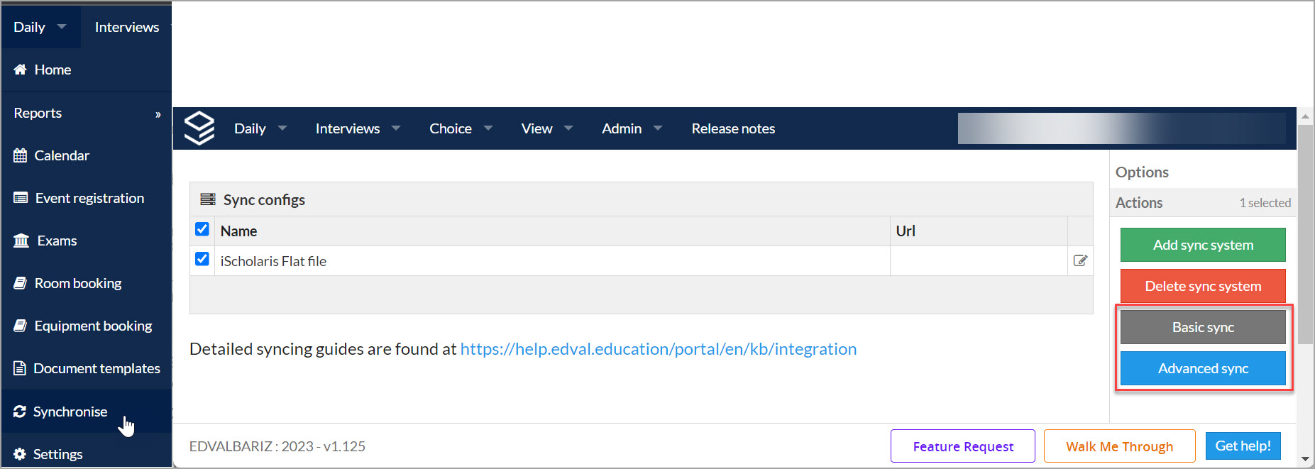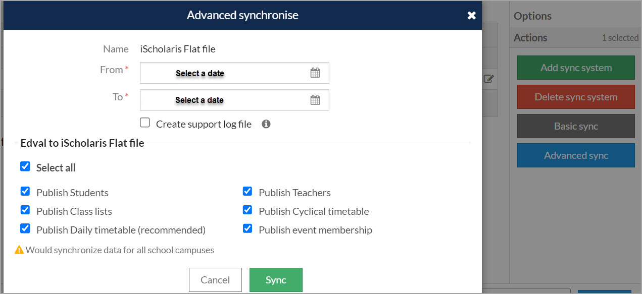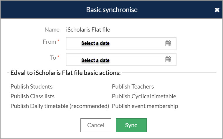 - Go to Daily > Synchronise and select the iScholaris Flat file configuration.