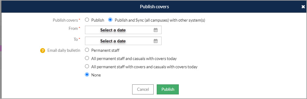 Publish Daily Timetable | Sends the following Daily data: Events, Covers, Absences, Assigned teachers, Assigned rooms, Cancelled classes. | Yes |