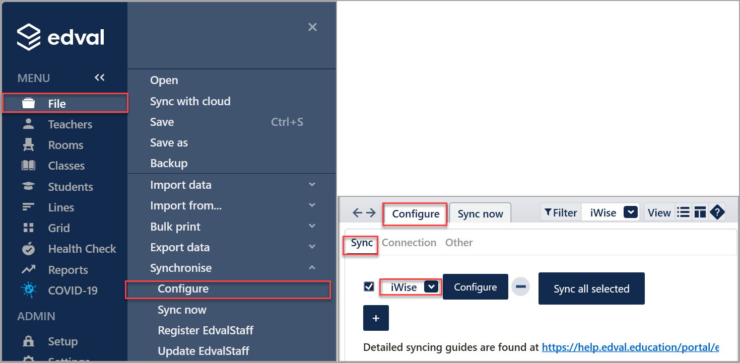- Open the relevant Tes timetable file, and go to File > Synchronise > Configure > Sync tab