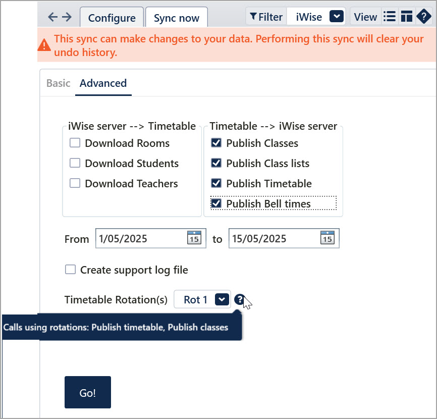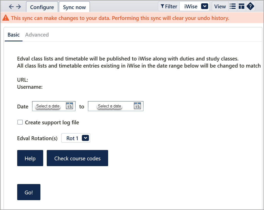 The Basic sync sends Class lists, Timetable, Duty Roster and Study classes to iWise for the desired time period, and downloads student and teacher data into the file.