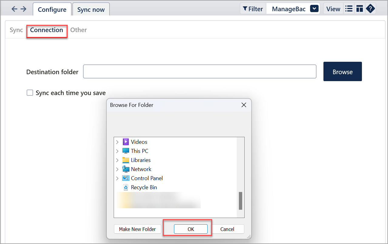 - Select the Configure button, which will move you to the Connection tab. A destination folder must be selected to direct where the .csv files will be saved. Select Browse and locate or create the desired location.