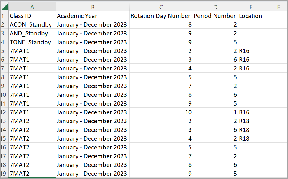 TimetableImport.csv | Class ID e.g. 7ART1 | Academic Year (This column will export the month that has been defined in other tab) | Rotation day Number, 1, 2, 3, e.g. This will record which day the class is happening. | Period Number e.g. 1, 2, 3 , L1, R1 | Location (Room) e.g. A1, A2 |
