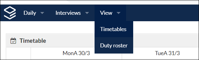 The View menu has options to view timetables and to view the Duty roster.
