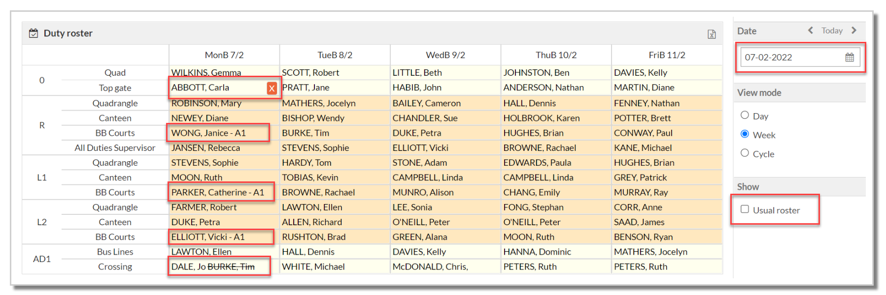 - Cancelled duties - displayed with a red cross as seen below for Carla Abbot's Top gate duty in P0
