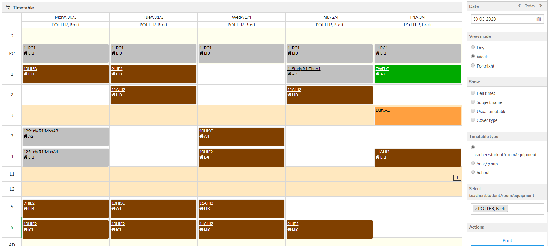 Select Teacher or Room | Allows you to search for a teacher or room. Type the room name or ‘room’ to get a list of rooms. Combined timetables - selection of multiple records of different types, such as a teacher and a room timetable together, or teacher(s) and student(s) together. Seeing the timetable of two or more resources shown together allows you to see when all are free, for example, for a meeting. |