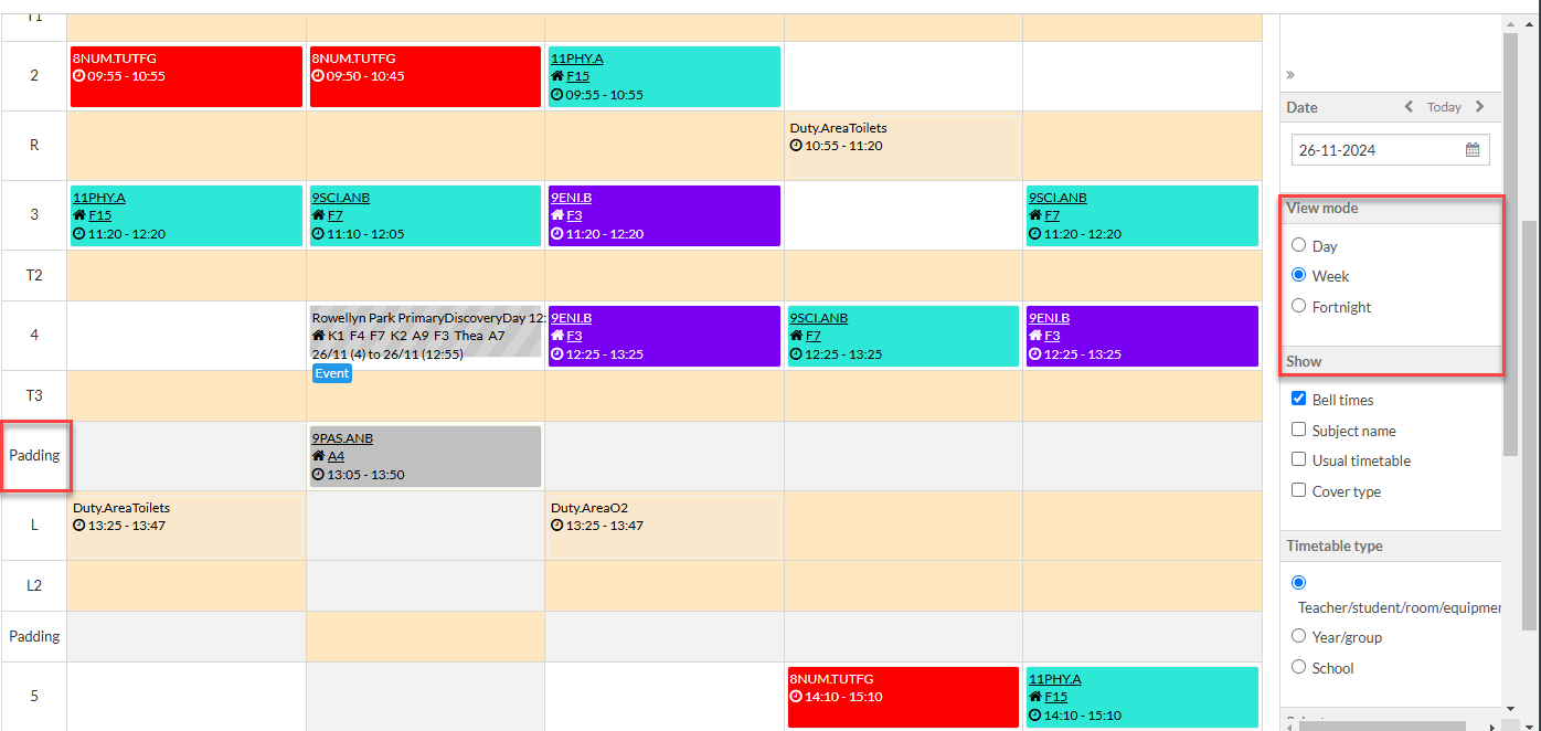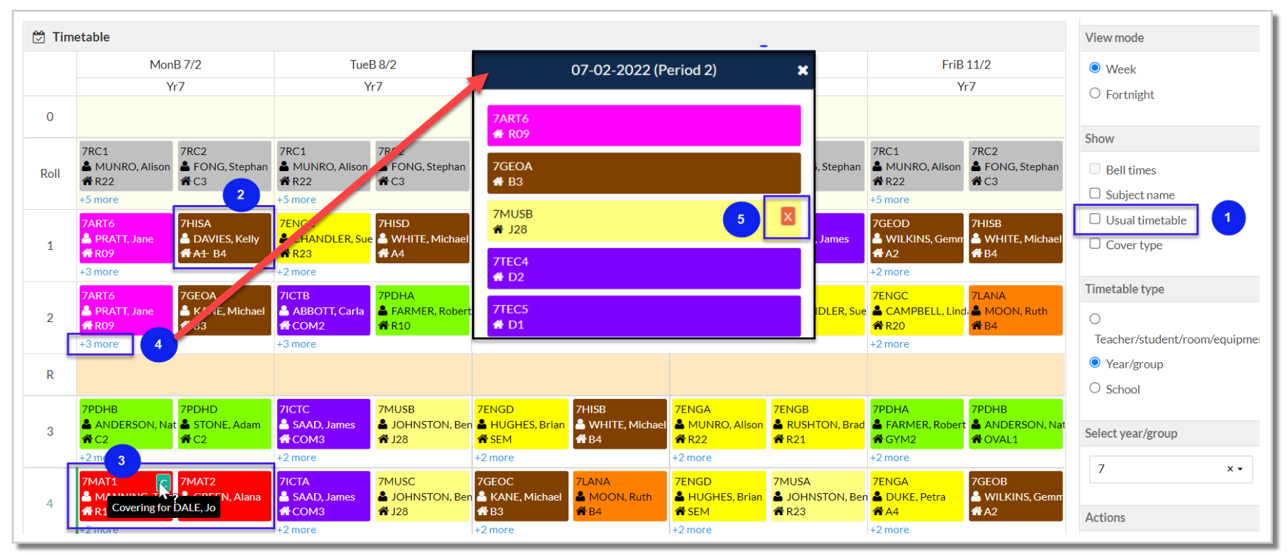 - When 'Usual timetable' is deselected, daily changes can be viewed on Year and Group timetables. This view is different to the usual timetable in that only 2 classes per period are displayed initially.