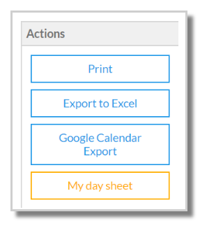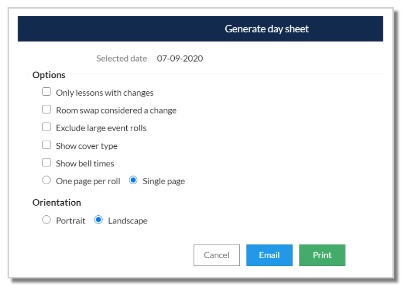 This option will create a pdf version of the Day Sheet report for the selected date which can be either printed or emailed. When the option is selected, a window will open with formatting options displayed, including the ability to show bell times. Select the required options then select either email or print to generate the Day Sheet.