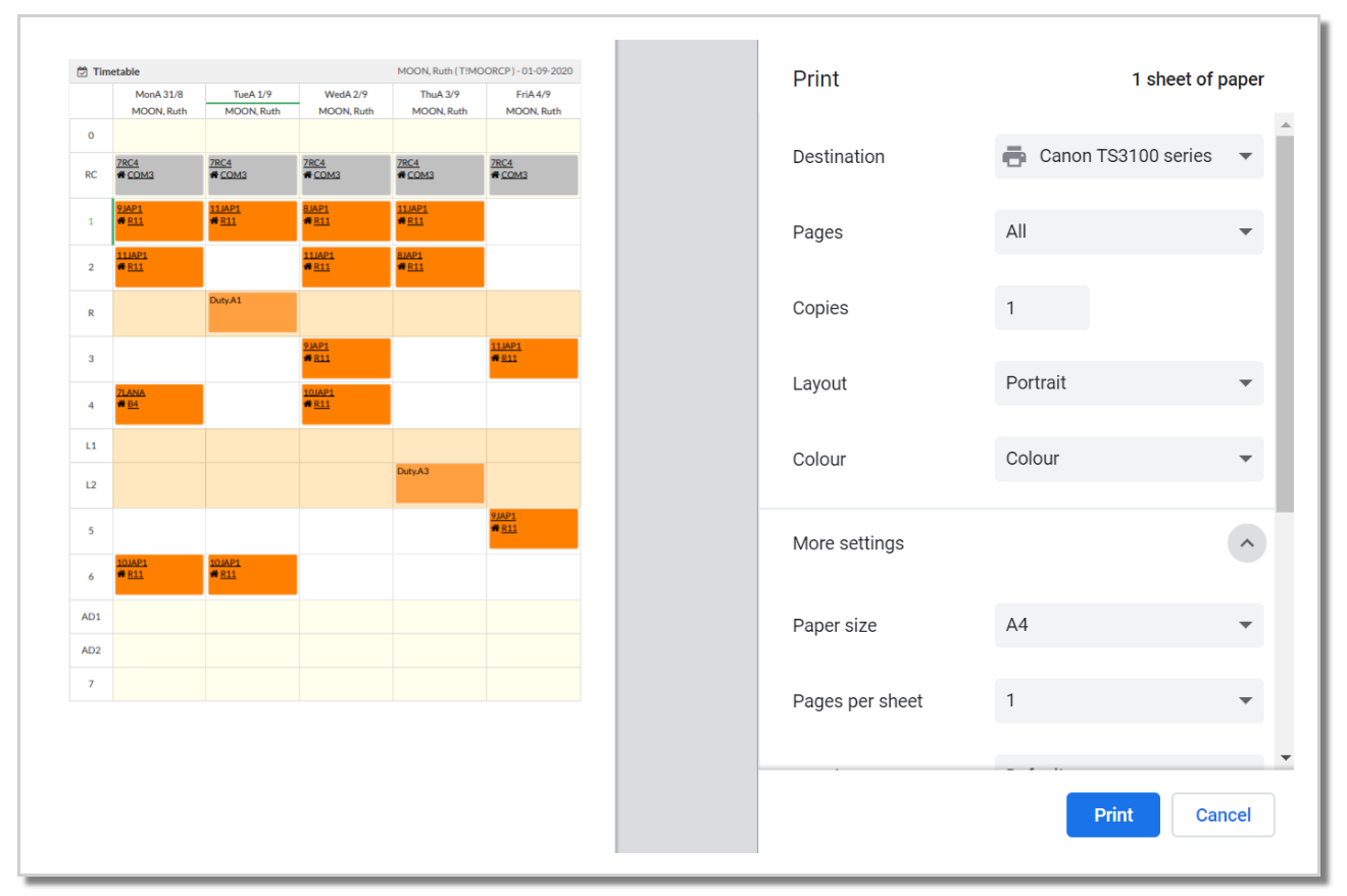 Any timetable can be printed as a colour PDF by selecting 'Print'. This will generate a preview page, reflecting exactly what is displayed on the screen. Before printing, ensure that the options selected for viewing reflect what is required for printing.