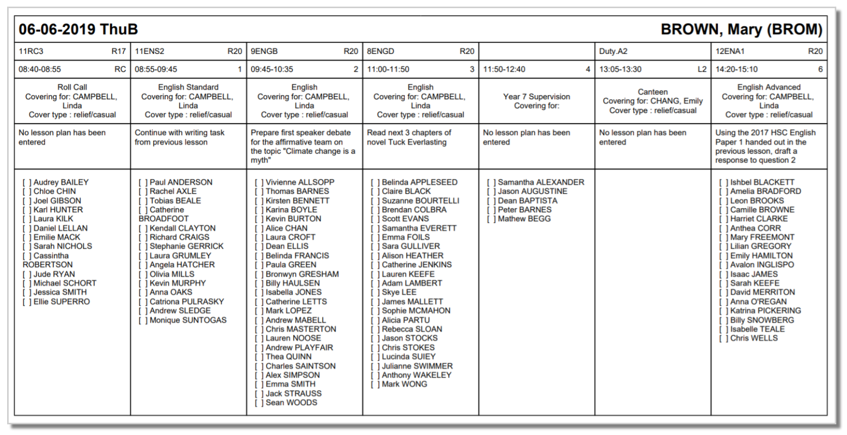 - Classes that are being covered will display a 'C' with the absent teacher displayed via a tooltip.