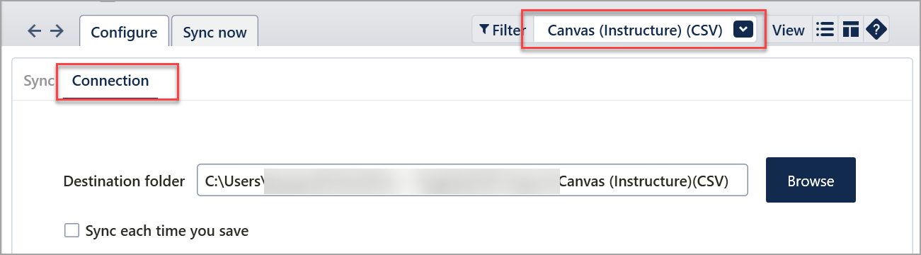 - In the Connection tab, select Browse to choose the output destination folder on your computer or network.