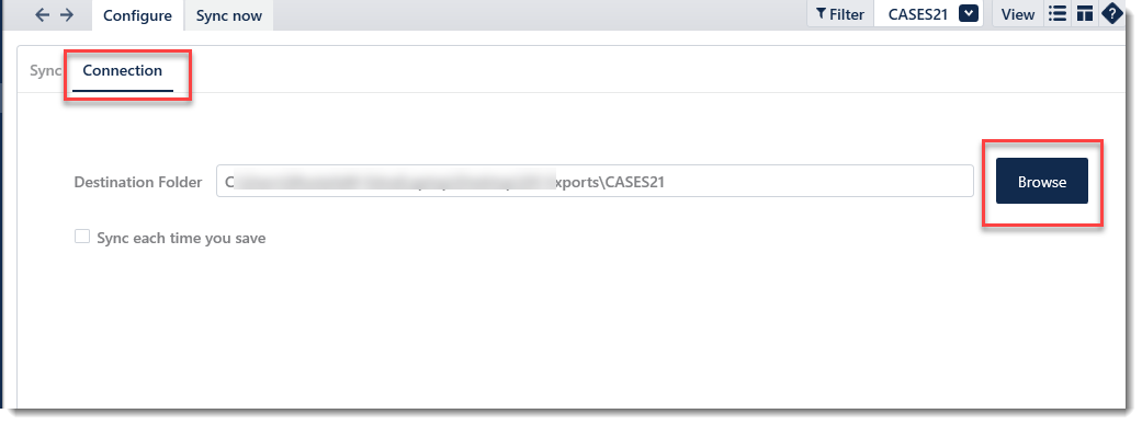 - In the Connection tab, select Browse to choose the output destination folder on your computer or network.