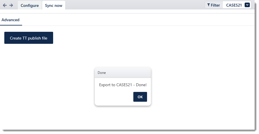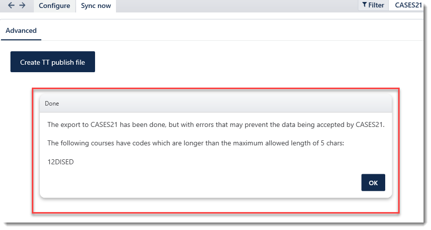 Once the sync settings have been saved, the data can be exported. The export will be performed whenever the timetable data changes and requiring another sync to CASES21.
