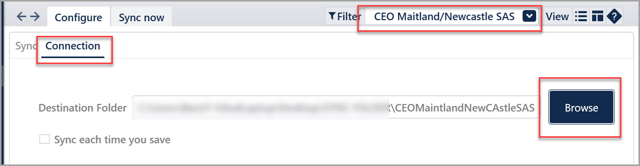 - In the Connection tab, select Browse to choose the output destination folder on your computer or network.