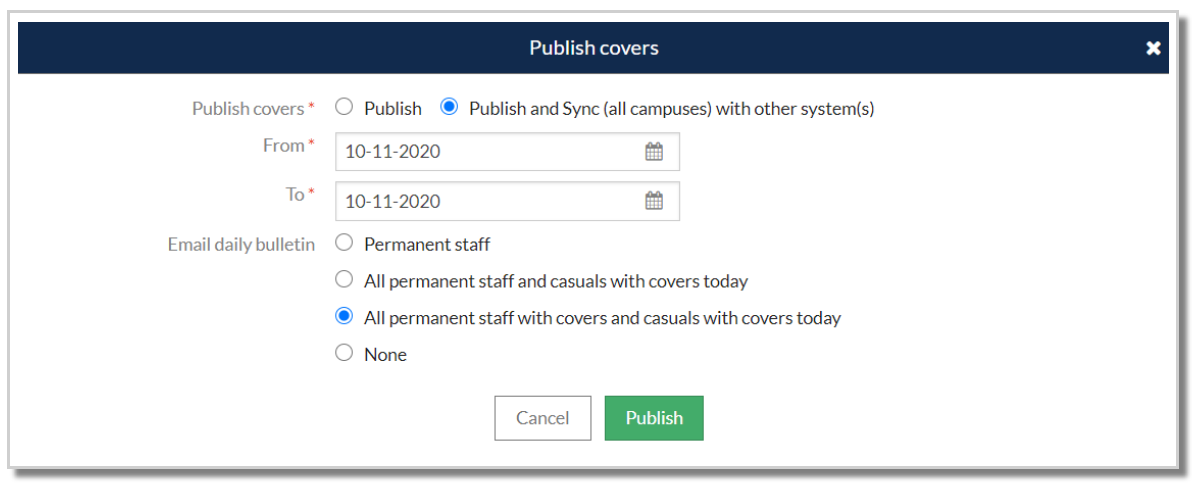 Syncing the daily changes, including class covers, room changes, lesson cancellations and events can be done from the Covers page. This type of sync through publishing will send classes, class lists and daily changes.