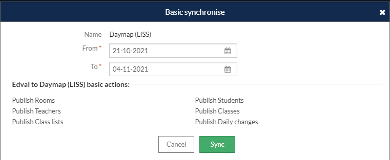 An Basic sync will send rooms, students, teachers, classes, class lists and cyclical timetable data for selected dates