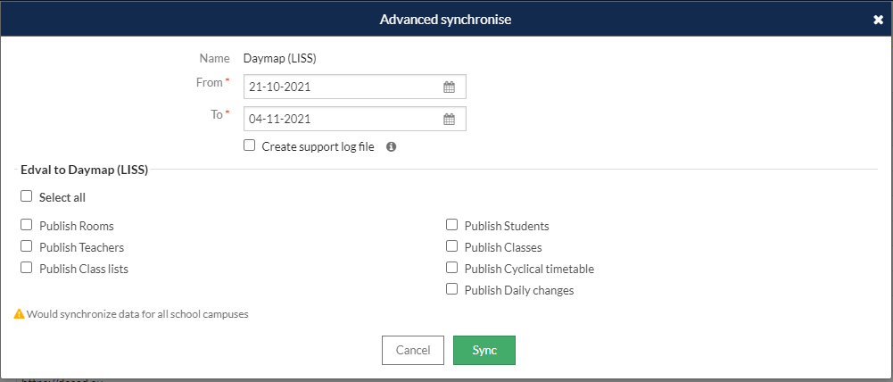 The Advance sync allows you to choose which data to immediately push through to Daymap. This feature is useful if you want greater control over which data is to be sent.