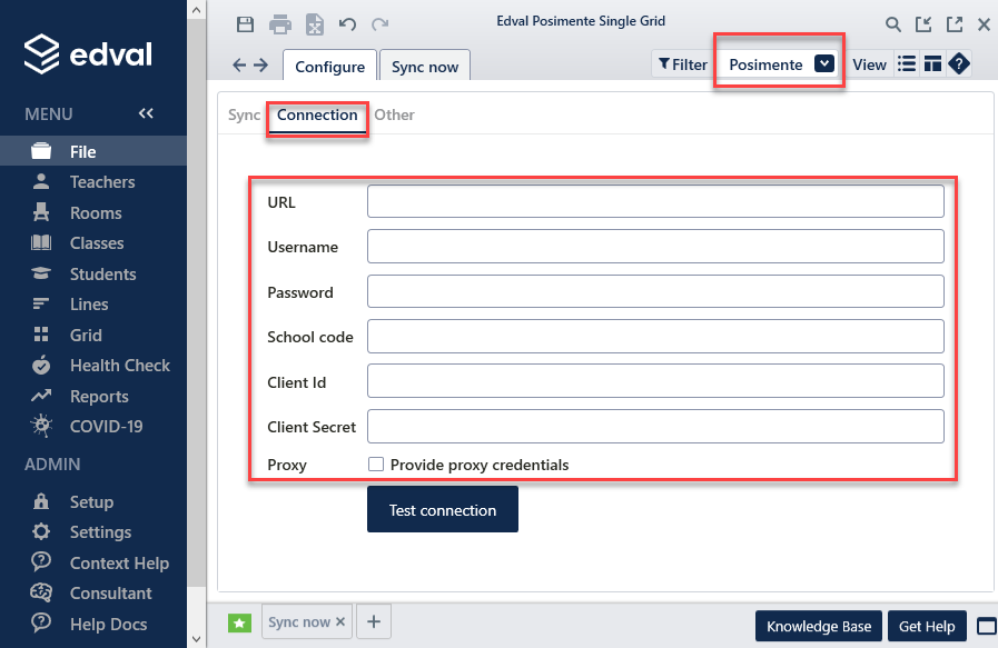 Input your credentials. Posimente will provide you with the URL, Username, Password, School code, Client Id, Client Secret.