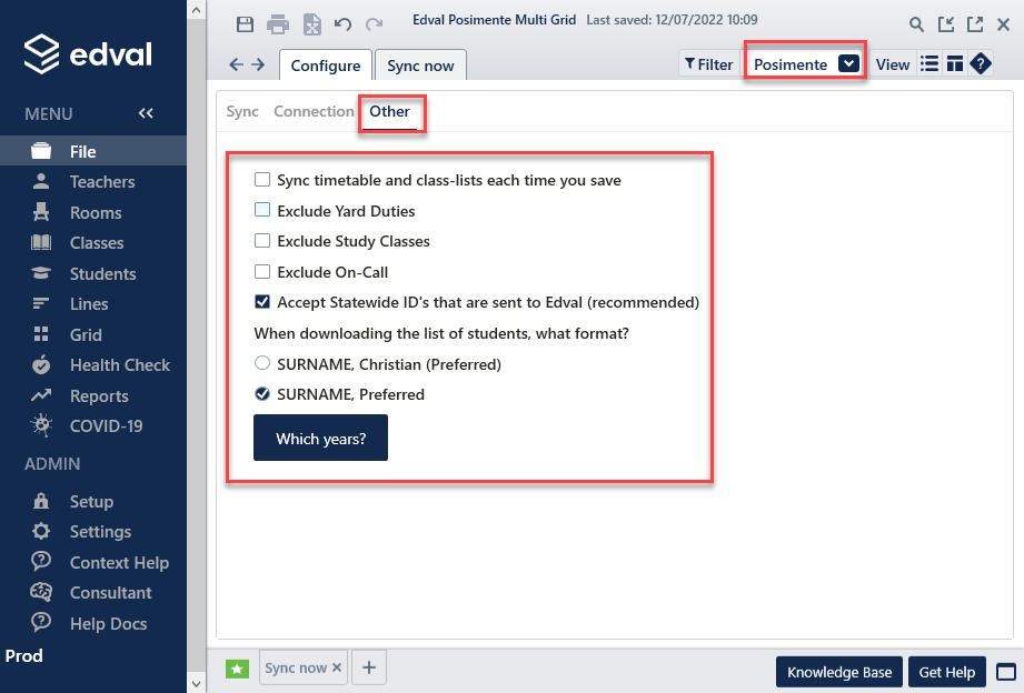 Which years? | This option allows you to select the specific year levels to sent to Posimente. Please leave all of the year levels un-ticked if you want all year levels to be synced. Note. This function will only appear if the timetable file is Multi grid. |