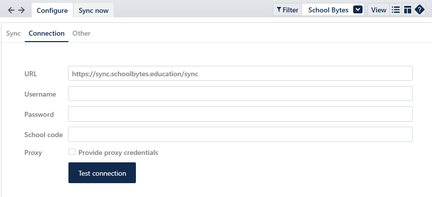 - In the Connection tab, enter your credentials that you received from School Bytes. (Contact School Bytes if unsure about these details).