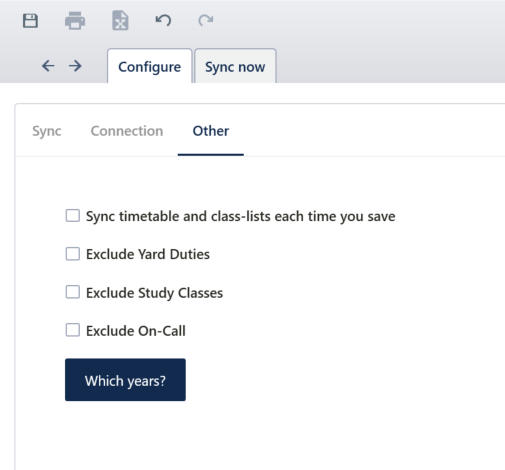 Option DetailsSync timetable & class lists every time you saveThis will send only the timetable and class membership data to School Bytes each time you save the fileExclude Yard dutiesWhen ticked Yard duties will be ignored for syncing purposesExclude Study classes When ticked Study classes will be ignored for syncing purposes Exclude On-calls When ticked On-calls will be ignored for syncing purposes Which years?This option allows you to select the specific year levels to sent to School Bytes.