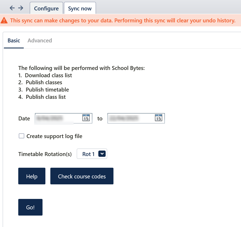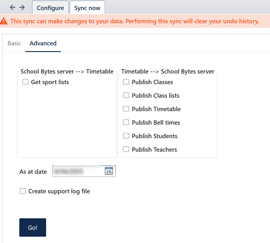 Create support log file: Occasionally, Tes specialists may ask you to perform a sync and tick this box, which will create a text file in the same location as the timetable file. This file can be sent to Tes to help with troubleshooting.