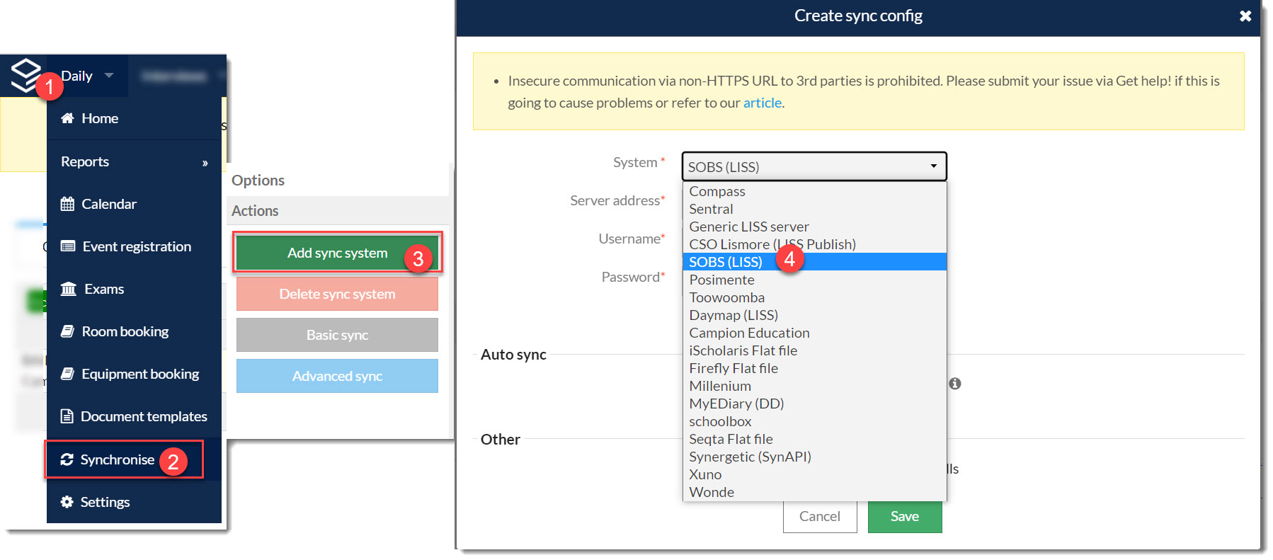 - Go to Daily --> Synchronise --> Add sync system and choose 'SOBS (LISS)' from the 'System' dropdown