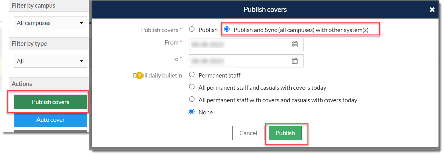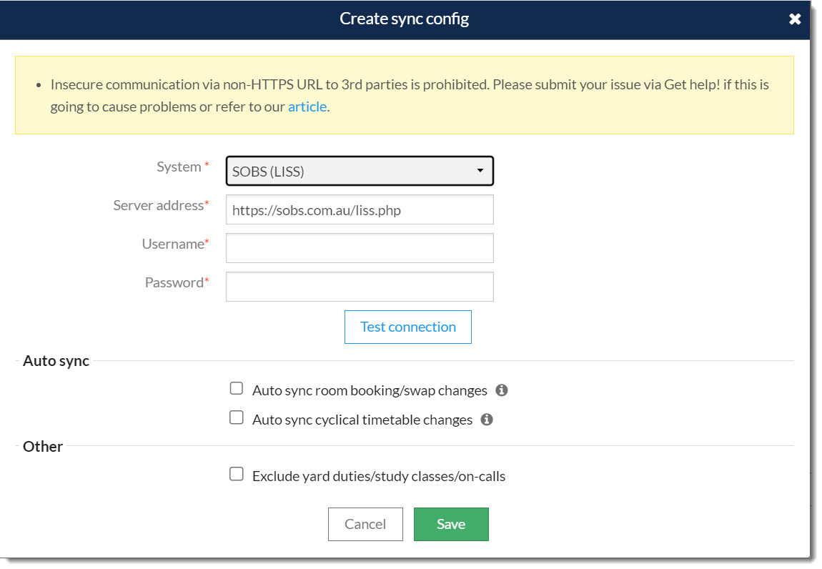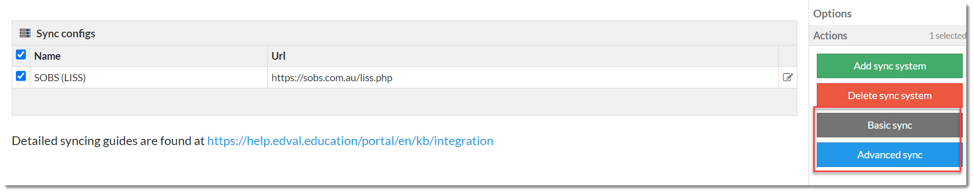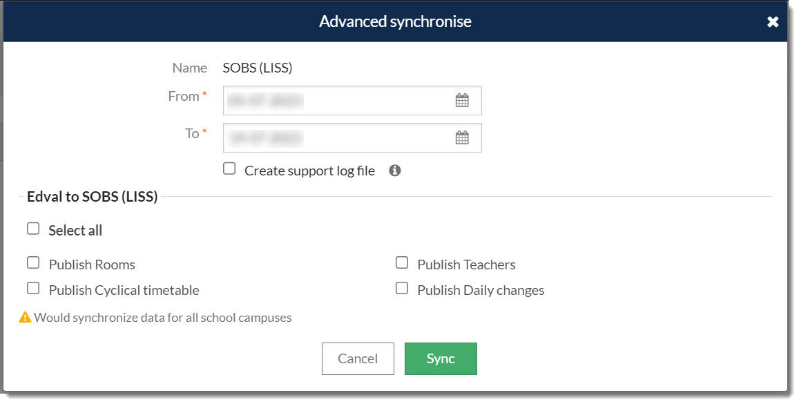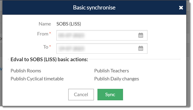 - Go to Daily --> Synchronise > Choose SOBS from the 'Sync configs'There are three sync options: Basic, Advanced, Publish and Sync.Basic SyncThe Basicsync sends Rooms, Teachers, Cyclical timetable and Daily changes to SOBS for the desired time period.To perform a Basic sync: