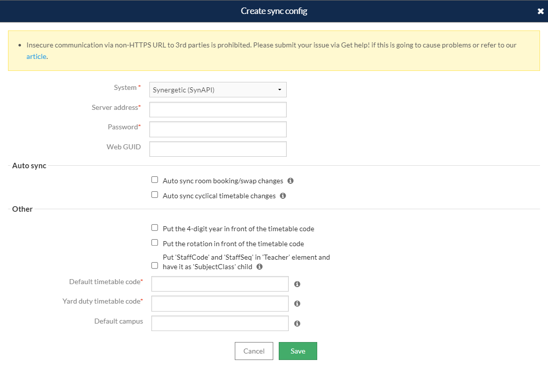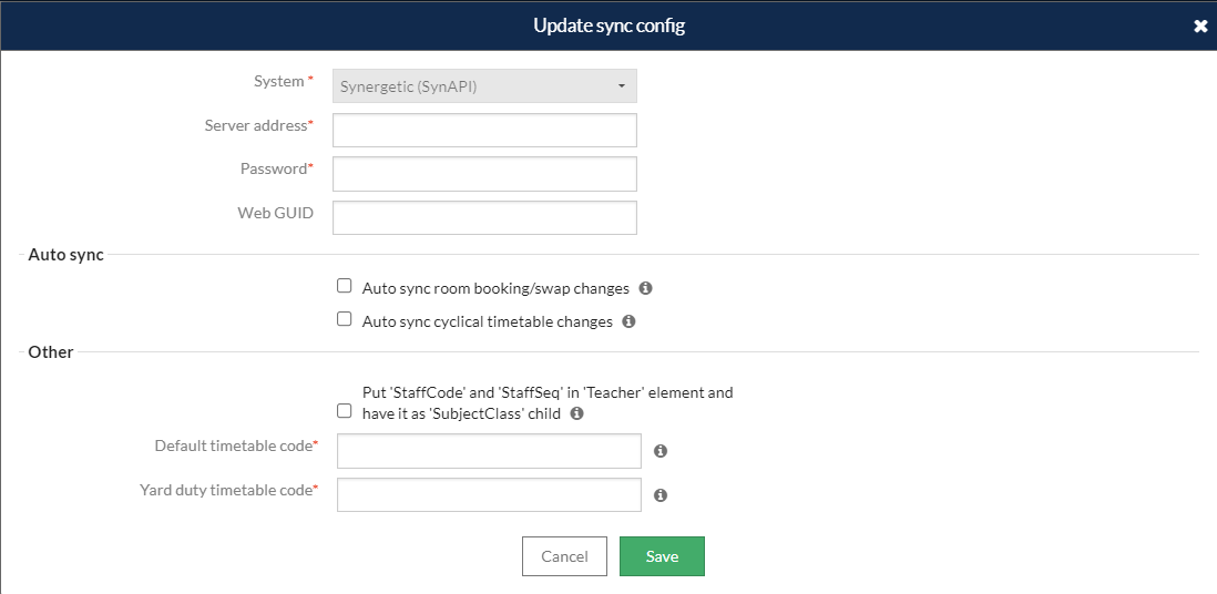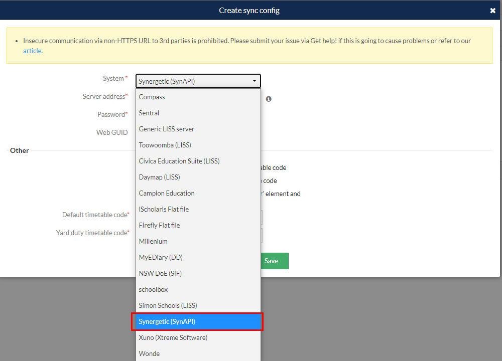 - Enter your Synergetic details for server address, password and web GUID. If you're unsure about any of these please contact Synergetic support for clarification.