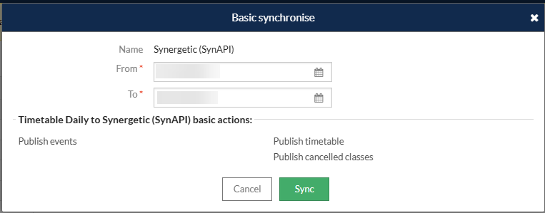 A basic sync will send rooms, students, teachers, classes, class lists and cyclical timetable data for selected dates