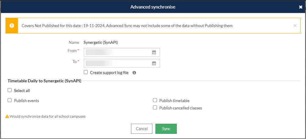 Syncing the daily changes, including class covers, room changes, lesson cancellations and events can be done from the Covers page. This type of sync through publishing will send classes, class lists and daily changes.