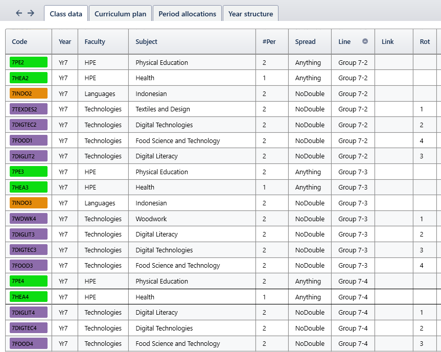 If just Yr7 rotate their TAS classes, doing 1 subject per term, set up 4 rotations. Assign the rotation number to each class by entering a value in the Rot column.