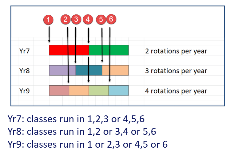 If Yr 7 have 2 rotations for Humanities, Yr 8 have 3 rotations for Language, and Yr 9 have 4 rotations for Art/Tech define 12 rotations. Assign the rotation to each class as follows: