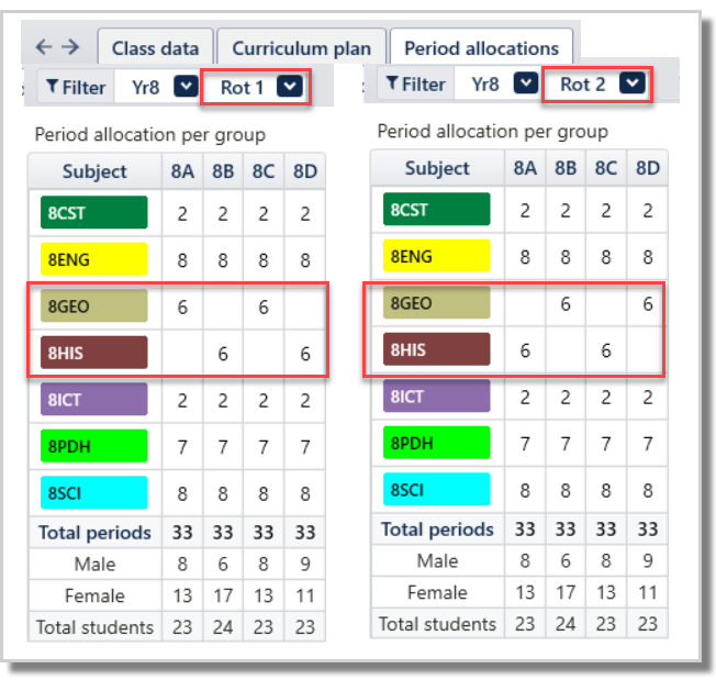 For example, if Yr7 have 4 rotations for Technology, Yr8 have 3 rotations for Language, and Yr 9 have 2 rotations for History and Geography, then a total of 12 rotations is required. The assignment of rotations for classes would be: