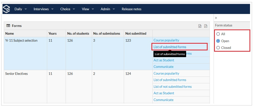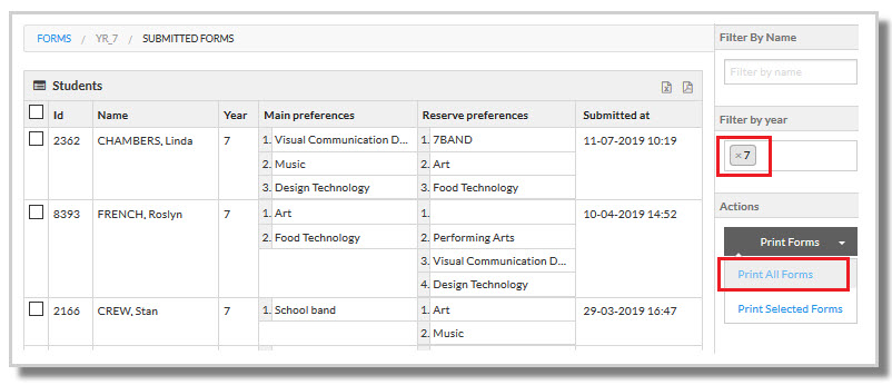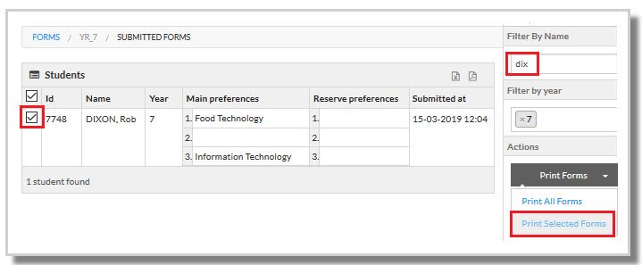Print forms: Print all or selected submitted forms in the same view as students are able to print.