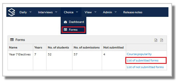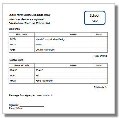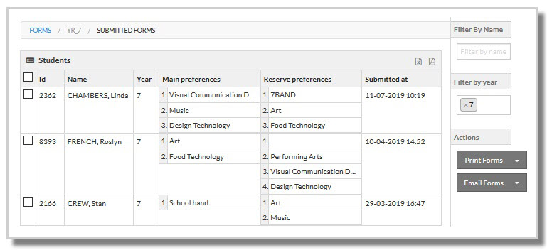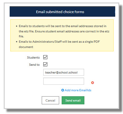 Schools sometimes wish to print or email student submission forms, either selected students only or all students. Forms may be emailed as PDF documents to all or selected students, and / or to any email address entered by the user.