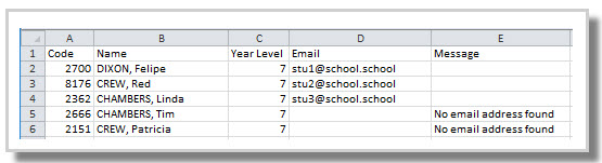 If the Students were selected, a csv report will be emailed to the user who actioned the Email forms function. The report lists the students involved along with their stored email addresses. It is useful for finding any students who do not have an email address in the system.