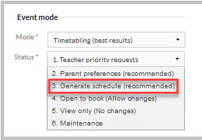 Generate schedule status is only applicable to Timetabling mode. For schools using Booking mode, proceed to the document 'Timetable Interviews: Event Status 4 - Open to book'.