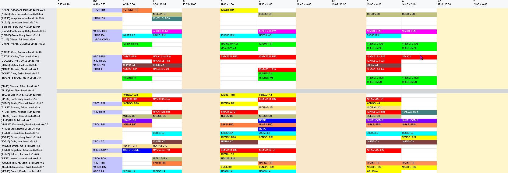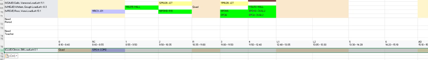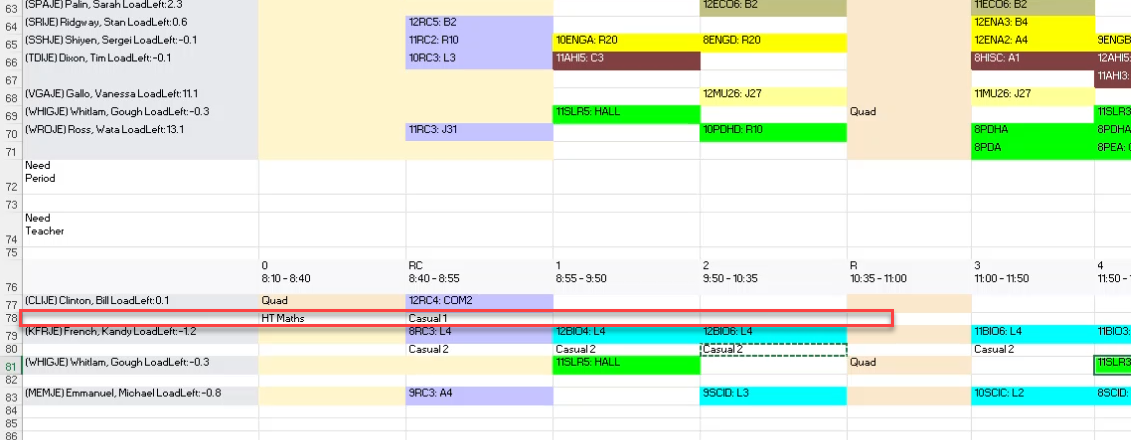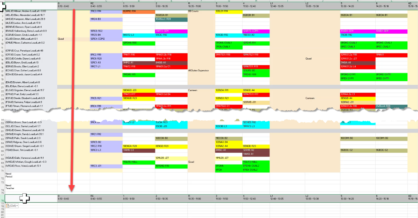 - Leave one row gap between teachers, to use to enter teachers / casual that are going to cover classes